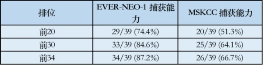如下图所示,EVER-NEO-1在各个排位阈值下的捕获能力均高于斯隆凯特琳癌症中心 (MSKCC)开发的肿瘤新抗原算法识别系统,显示出其在识别具有免疫原性突变方面的优越性,预示了EVER-NEO-1在开发个性化肿瘤疫苗或其他免疫治疗策略时具有更大的潜力。