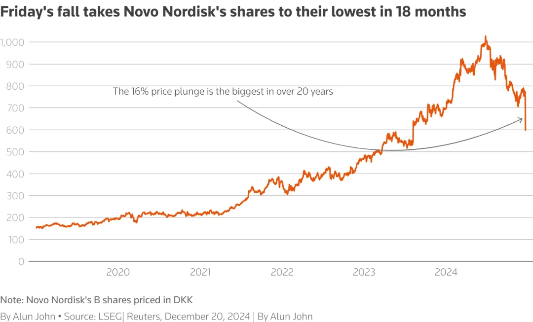 2024年11月,安进先一步披露MariTide的II期结果,最高减重20%,虽然高于I期临床减重16%的数据,公司股价不升反降。紧接着,类似悲剧在诺和诺德身上重演。