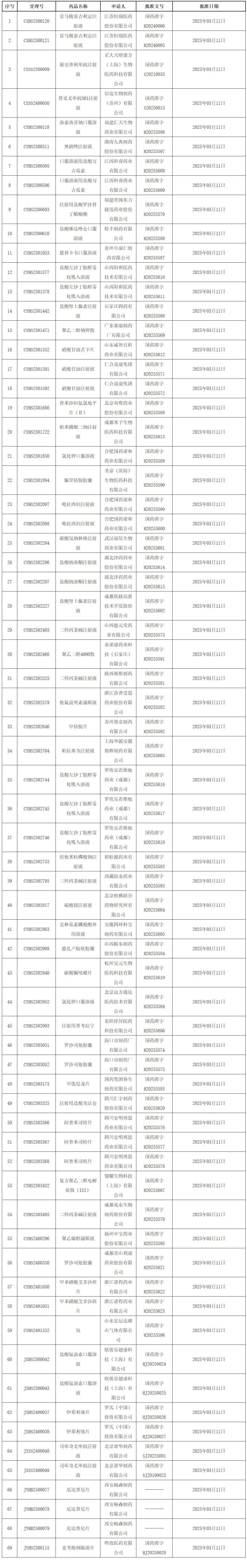 刚刚,NMPA发布2025年03月14日药品批准证明文件送达信息,本批次共有69个受理号获批,多款重磅新药获准上市,其中:
