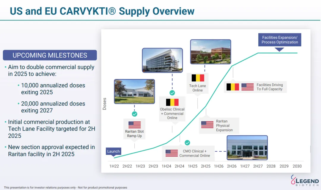作为扩产的重要一步,传奇生物已获得 FDA 批准,授权其第三方生产商诺华在新泽西州 Morris Plains 工厂为 Carvykti 进行商业化生产。该工厂已于今年第一季度启动商业生产,预计将在第二季度带来“显著”增长。自2023 年 4 月传奇生物和强生与诺华签署了一份为期三年的生产合同后,诺华一直在为传奇生物和强生生产Carvykti 的临床批次产品。