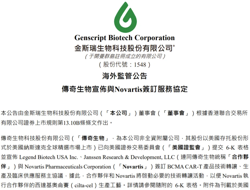 2023年11月,传奇生物宣布与诺华制药就其特定靶向DLL3