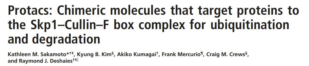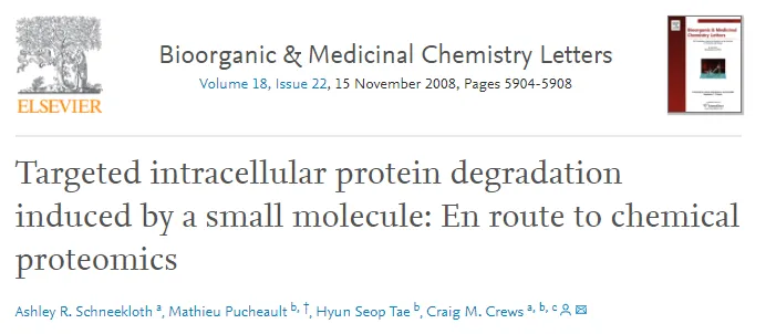 说到PROTAC分子的历史,还要追溯到Arvinas公司的联合创始人,耶鲁大学的Craig Crews教授,在2001年发表的一篇具有里程碑意义的论文。研究人员设计了一种人造双功能性分子,它的一端能够结合目标蛋白,另一端则是能结合E3连接酶的多肽。研究发现,这种分子能将目标蛋白拉到E3连接酶附近,让E3连接酶给目标蛋白打上泛素标签,标记它们送入细胞的蛋白酶体系统进行降解。