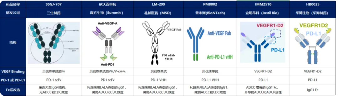结构设计上如下图所示,三生制药的制药如下图所示,它采用的Fc段接近天然的IgG4结构,没有ADCC和CDC效应,这方面和康方,礼新以及普米斯的思路是较为相似的,希望以此不会引发安全性问题;宜明昂科则希望通过改造Fc段增强ADCC效应,以此增强双抗的杀伤力。