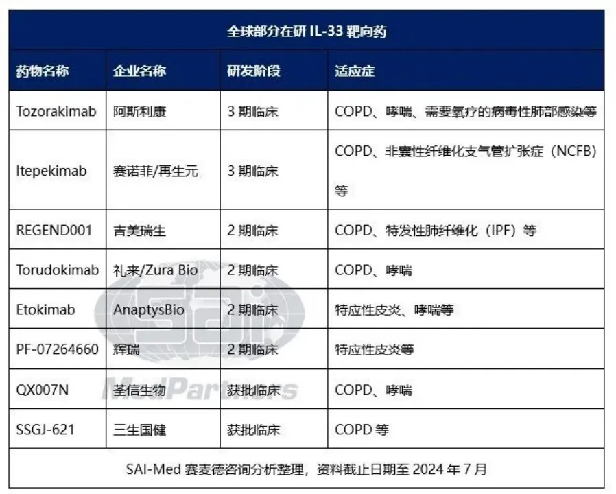 除此之外,IL-33单抗也是中美双报。这个靶点毕竟类似于TSLP,未来将主要用于COPD以及哮喘等适应症的治疗,不过阿斯利康在该靶点的COPD适应症上临床II数据并不算好。现在大家将目光落在了赛诺菲的itepekimab身上。