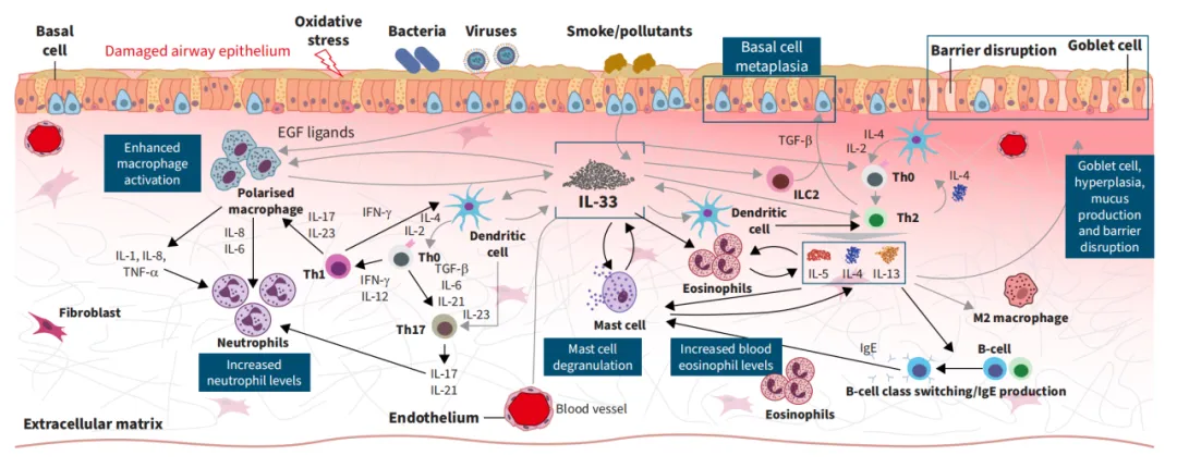 这里以赛诺菲的itepekimab为例进行分析。该靶点的通路之广泛如图所示,在COPD的三期临床试验——AERIFY-1和AERIFY-2中,主要终点被设计为AECOPD的发生率(COPD加重期),目前还没有临床数据读出。在临床IIa期的数据方面,安慰剂组