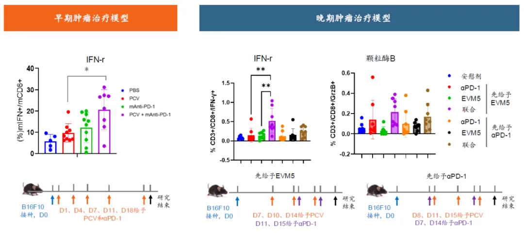 临床前研究显示,EVM16在多种小鼠模型中都激发出了强烈的新抗原特异性T细胞免疫反应,在小鼠黑色素瘤B16F10模型中实现了显著的肿瘤生长抑制。此外,EVM16与PD-1抗体联用后具有协同抗肿瘤效果,支持这类联合疗法的临床开发。