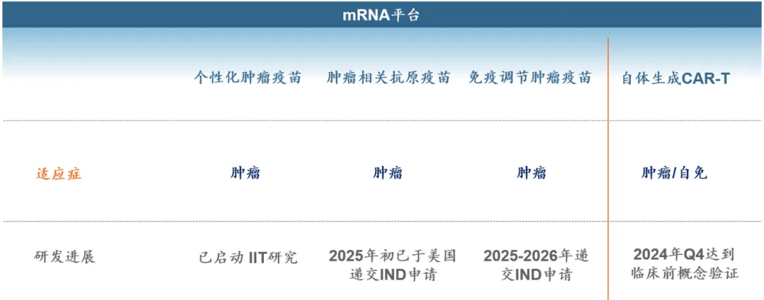 经过过去3年多的探索与变革,云顶新耀已成功将经过临床验证的自研mRNA平台本地化,构建了一个涵盖从抗原设计、mRNA序列优化,LNP递送技术开发到产业化生产的全球屈指可数的端到端全产业链平台,并搭建了包含mRNA个性化肿瘤新抗原疫苗、现货型肿瘤相关抗原(TAA)疫苗、免疫调节肿瘤疫苗以及自体生成CAR-T在内的多样化管线。