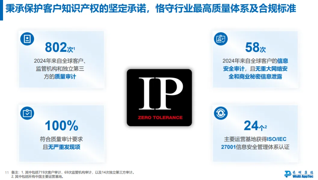 质量体系与客户的 IP(知识产权)保护可被视作 CXO 服务的两大基石。2024年,药明康德接受了来自全球客户、监管机构和独立第三方的质量审计达到802次,相当于平均每个工作日都要接受3.2次审计,均100%符合质量审计要求且无严重发现项;此外还有来自于全球客户的58次信息安全审计,也没有发现重大网络安全和商业秘密信息泄露事件。