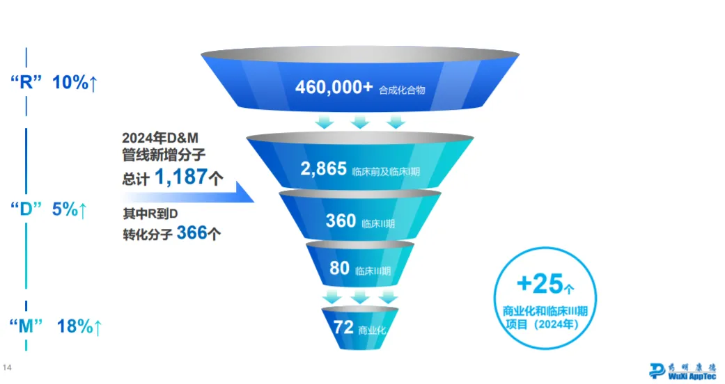 2024年,药明康德R端合成小分子数达到46万个,数字比Q3再增一万,而位于中后期的D&M阶段管线新增分子达到1,187个,其中R到D转化而来的分子有366个。