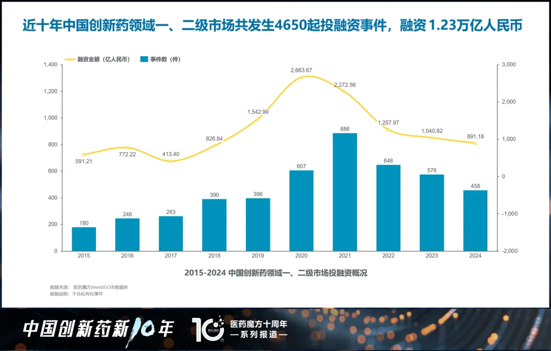 过去十年,中国资本最舍得投资的行业,除了新能源和芯片之外便是生物医药,而创新药更可谓是生物医药“皇冠上的明珠”。根据医药魔方InvestGo数据库的统计,在2015-2024这十年间,中国创新药从一二级市场筹集到的资金总额达到1.23万亿元。