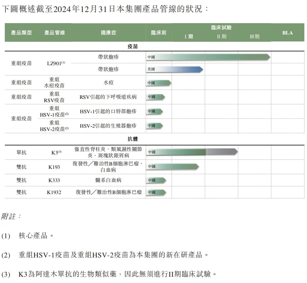 在研管线方面,包括三款临床阶段的在研产品,其中一款为核心产品LZ901;以及六款临床前阶段的在研产品,分别是重组水痘疫苗、重组RSV疫苗、重组HSV-1疫苗、重组HSV-2疫苗、用于治疗髓系白血病的K333双特异性抗体和用于治疗淋巴瘤的K1932双特异性抗体。