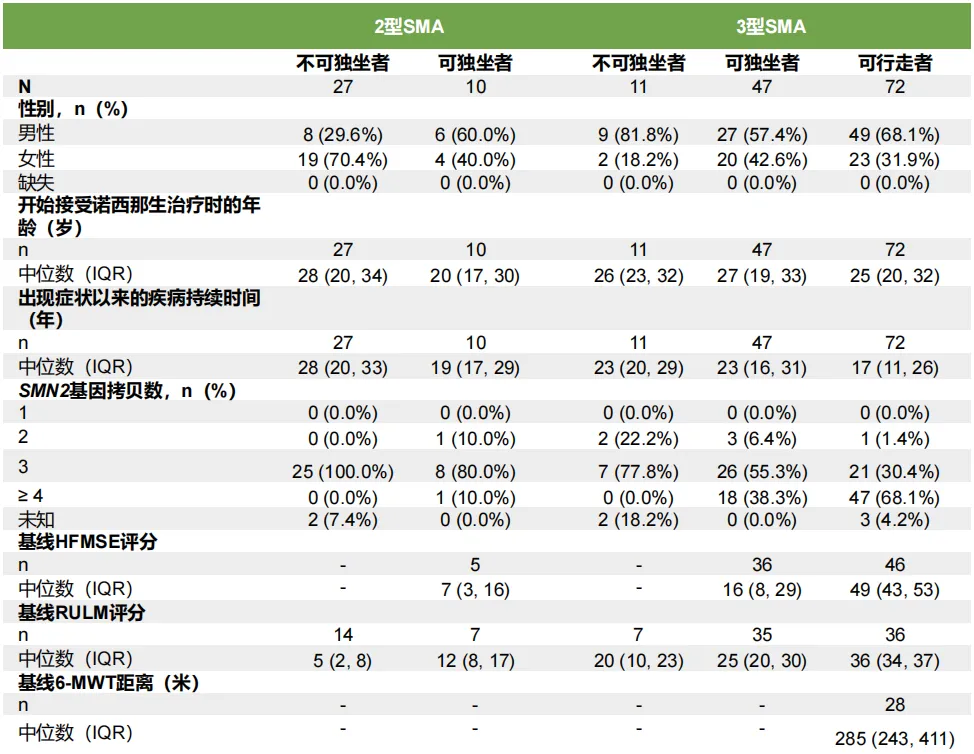 表1. 基于SMA分型(2型和3型)和运动功能状态的基线特征