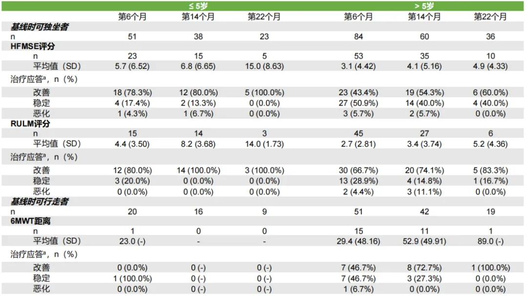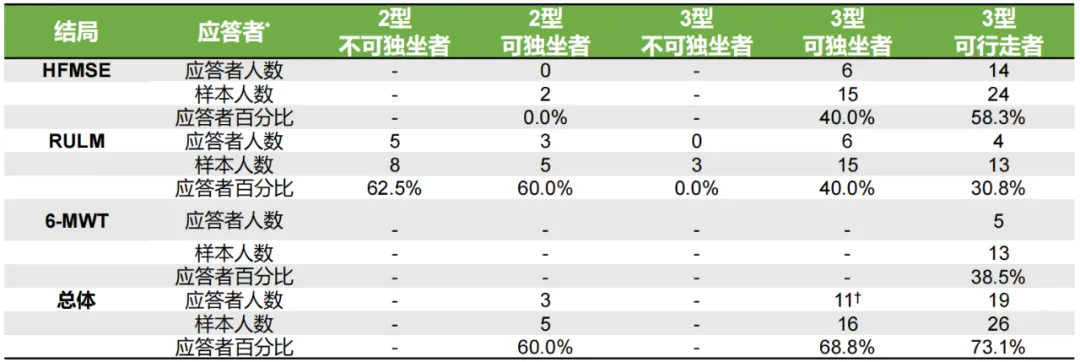 分析中将HFMSE(Hammersmith功能运动扩展量表)评分改善≥3分、RULM(上肢模块修订版)改善≥2分、6-MWT(6分钟步行试验)改善≥30米定义为各量表具有临床意义的改善,即治疗应答。在以上三个量表中任意一个中获得有临床意义改善的患者比例即被称为整体应答率。