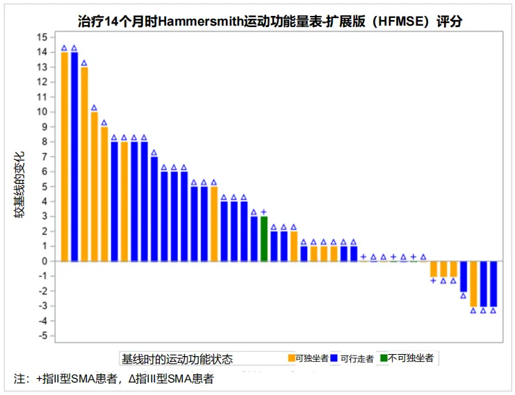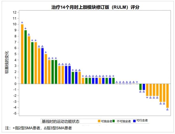 根据SMA类型(2型和3型)和运动功能分类,评估治疗后14个月的运动功能指标反应