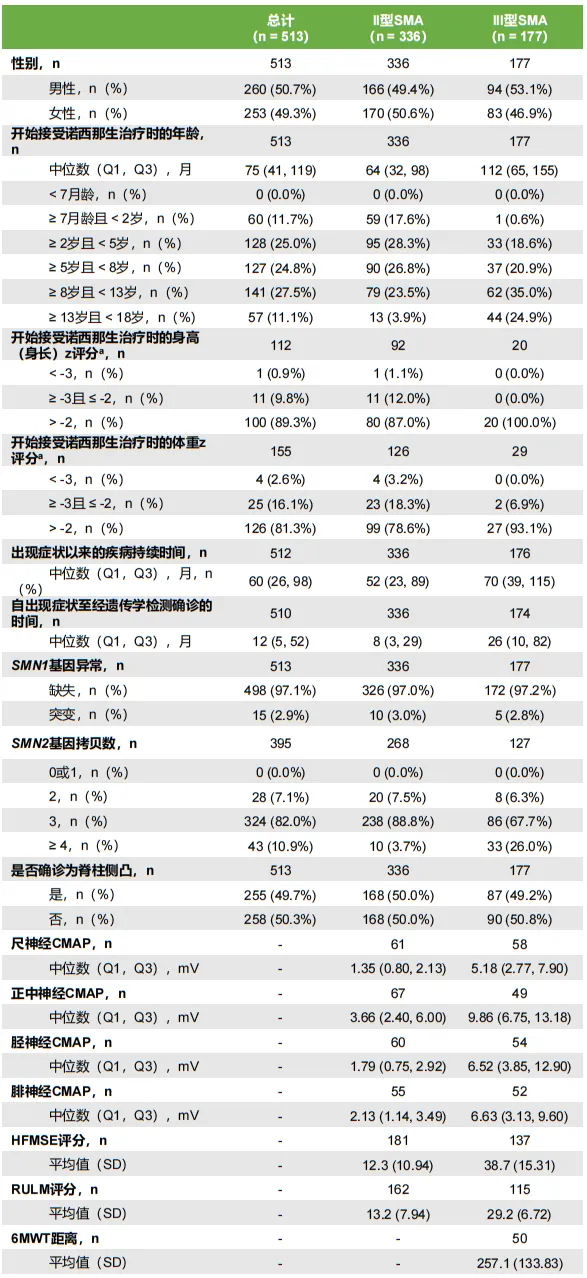 本次分析纳入了经基因检测确诊为2型或3型、且年龄<18岁的5q SMA患者。所有入组患者均接受诺西那生作为其首次DMT药物。疗效终点为开始诺西那生治疗后第6、14和22个月的治疗反应,采用HFMSE、RULM和6-MWT进行评估。研究共纳入513例5q SMA患者,其中包括336例2型SMA患者和177例3型SMA患者(表3)。