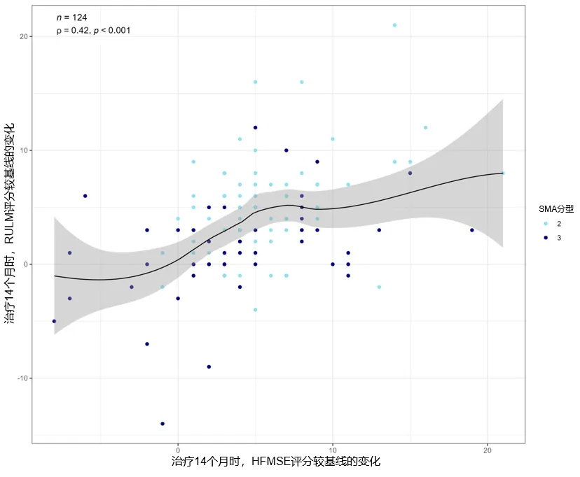 图3. 2/3型SMA患者从基线到第14个月的HFMSE评分变化与RULM评分变化之间的Spearman秩相关性分析