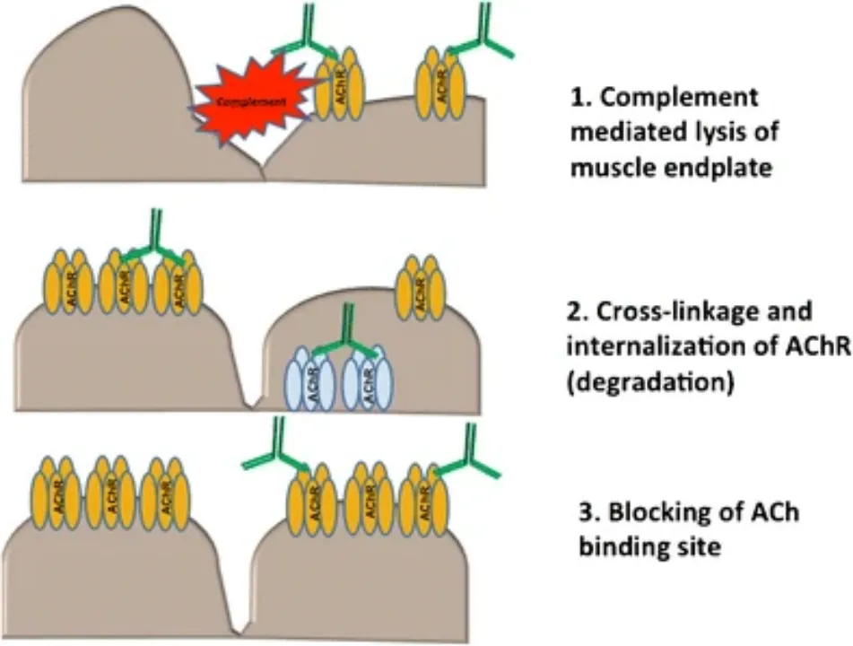 更加详细的机制阐述如下图所示:乙酰胆碱受体(AChR) 重症肌无力的终板病理有三种机制:1) 抗体与 AChR 结合并激活补体,导致局灶性终板溶解;2) 抗体交联相邻的 AChR,导致内化和降解;3) 抗体直接与乙酰胆碱 (ACh) 结合位点结合,阻断 ACh 的进入。