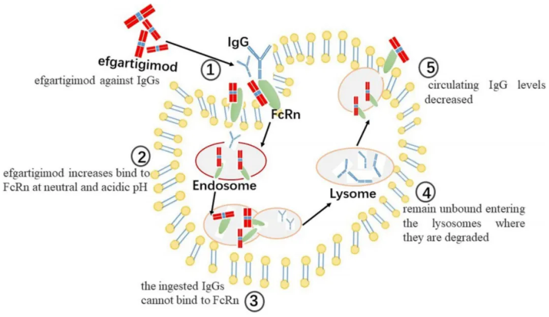近年来,以其成名的大单品为argenx的艾加莫德,是全球首个开发及获批的FcRn拮抗剂。FcRn是一种位于细胞膜表面的lgG抗体受体,也被称作“新生儿”Fc受体。艾加莫德对于FcRn的亲和力高于IgG的Fc片段的亲和力,当艾加莫德与FcRn结合之时,致病性IgG就无法再与FcRn结合,这会使得IgG更多进入溶酶体降解,从而使自身抗体循环水平迅速降低。具体作用机制如图所示。