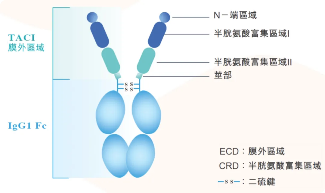 先介绍机制,它是一款很有特色的双靶点融合蛋白。泰它西普是一种双特异性融合蛋白,能够同时结合并中和B细胞活化因子(BLyS)和增殖诱导配体(APRIL)。这两种因子在B细胞的成熟、存活和分化中起关键作用——它们参与前B淋巴细胞发育为成熟B细胞,最终发育成为专职产生抗体的浆细胞的整个过程。通过阻断BLyS和APRIL的信号通路,泰它西普能够有效减少B细胞的数量,降低自体抗体的产生,从而减轻自身免疫反应。具体结构如下图所示。