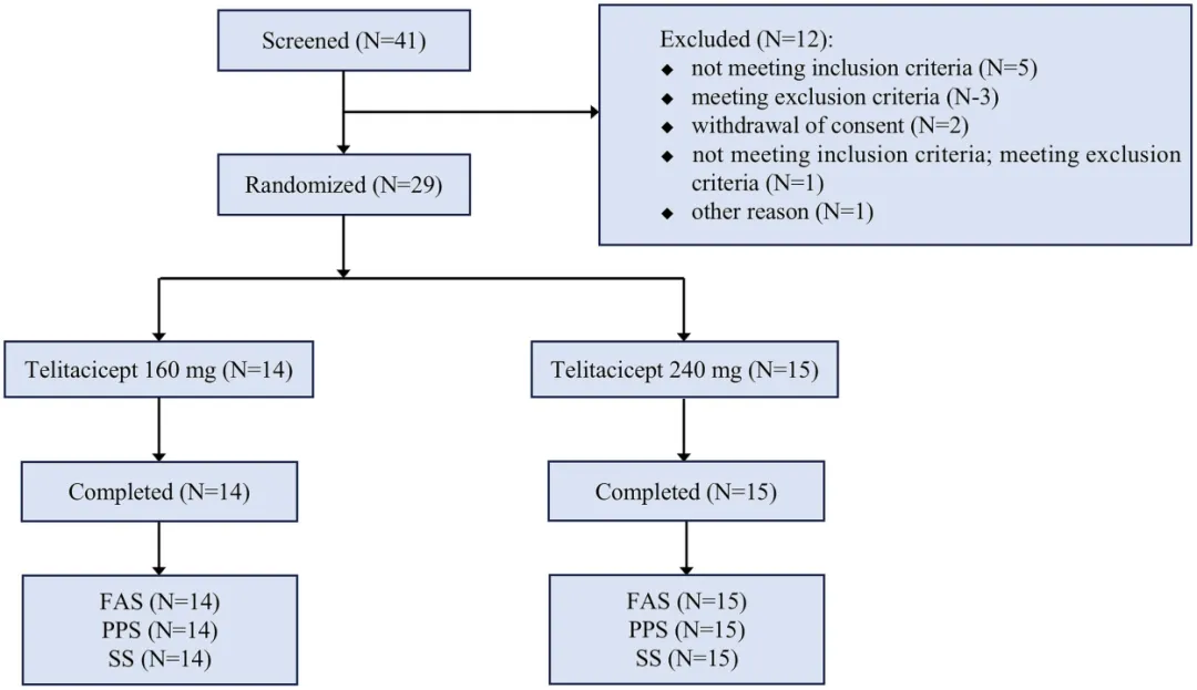 相关设计如下,经过排除后29名患者进入临床,分别以1:1进行分组接受160mg和240mg泰它西普注射。在这个过程中,主要衡量的指标是QMG(量化重症肌无力量表)评分的下降程度和重症肌无力临床绝对评分的下降程度,患者基线上,160mg组患者的QMG平均评分为18.4,而240mg组患者的QMG评分为19.3,绝对评分上分别为23.1和24.8;所有患者的乙酰胆碱受体抗体的测试均为阳性。