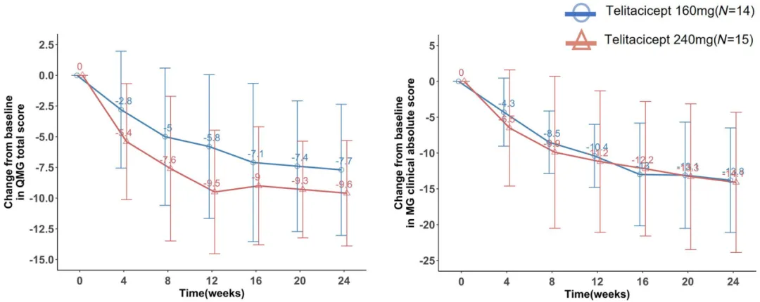 gravis)最后的临床结果如图所示,第24周时,在QMG评分上,160mg组平均下降7.7分,而240mg组平均下降达到了9.6分;在临床绝对评分上,分别下降12.1和14.1分。