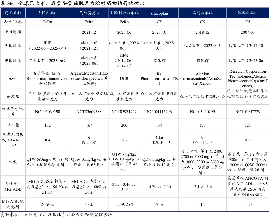 这里我们可以进行几款药物疗效的对比,近期相关的三期临床是安进的半年一针CD19单抗——伊奈利珠单抗,它最终的MG-ADL评分下降程度来看,,在第26周时,治疗组为评分变化为-4.2,而安慰剂组为-2.2。