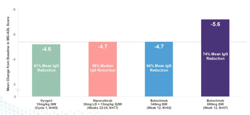 从疗效来看:batoclimab改善MG-ADL(MG患者日常生活活动能力量表)评分上与其他FcRn抑制剂疗效相当,其中340mg低剂量组的MG-ADL评分改善了4.7分(IgG水平平均降低64%),680mg高剂量组改善了5.6分(IgG水平平均降低74%),而安慰剂组为3.6分。