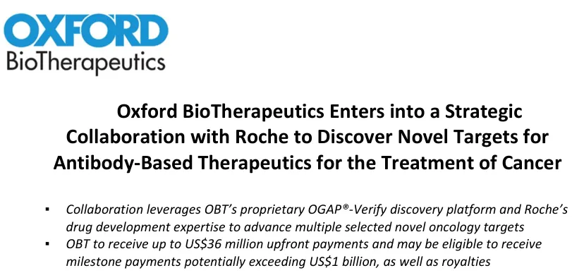 3月19日,罗氏(Roche)宣布与英国生物技术公司Oxford BioTherapeutics达成了一项价值超过10亿美元的生物技术合作,旨在开发新的抗体癌症靶点。