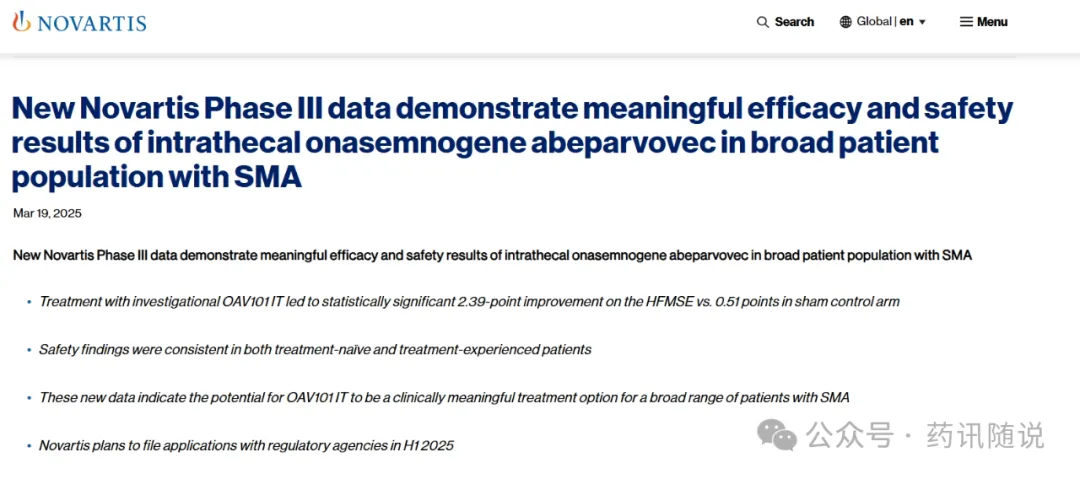 3月19日(当地时间),诺华(Novartis)宣布其在研的鞘内注射Onasemnogene Abeparvovec(索伐瑞韦、Oav101 IT)在2-18岁脊髓性肌萎缩症(SMA)患者III期临床研究(STEER)积极结果:Oav101组主要终点汉默史密斯功能运动量表扩展版(HFMSE,评估SMA患者的粗大运动功能的金标准)评分改善2.39分,而假注射组则为0.51分,组间差异1.88分(p=0.0074)。