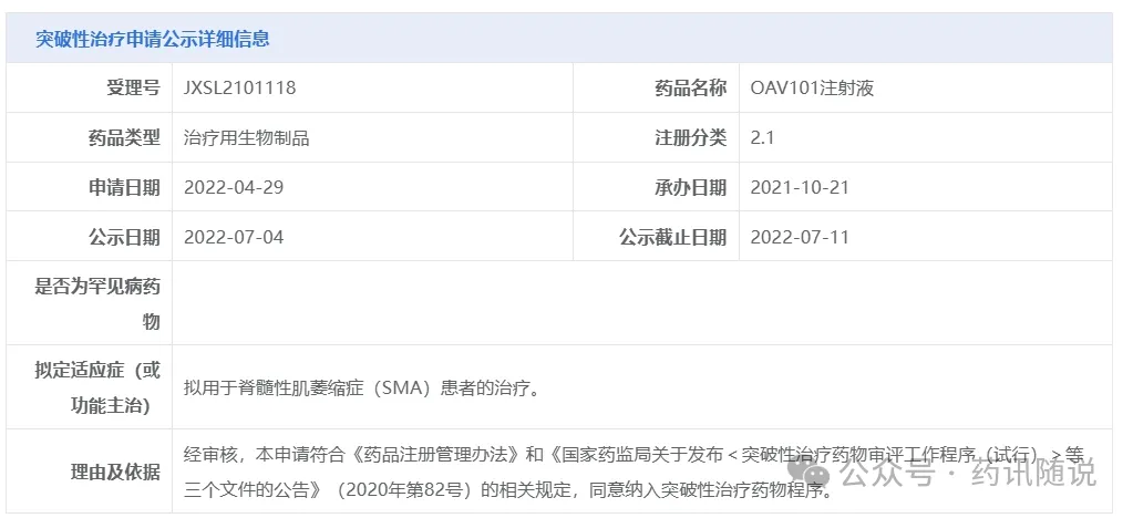 Onasemnogene Abeparvovec(Oav101 IT)是用于治疗脊髓性肌萎缩症(SMA)的一次性基因疗法,也是唯一一种旨在通过替换缺失或不起作用的SMN1基因的功能来直接解决疾病的遗传根源的SMA治疗方法,通过单次一次性静脉输注持续表达SMN蛋白来阻止疾病进展。