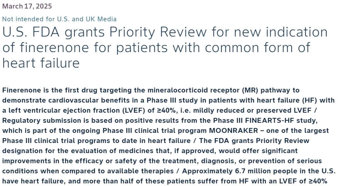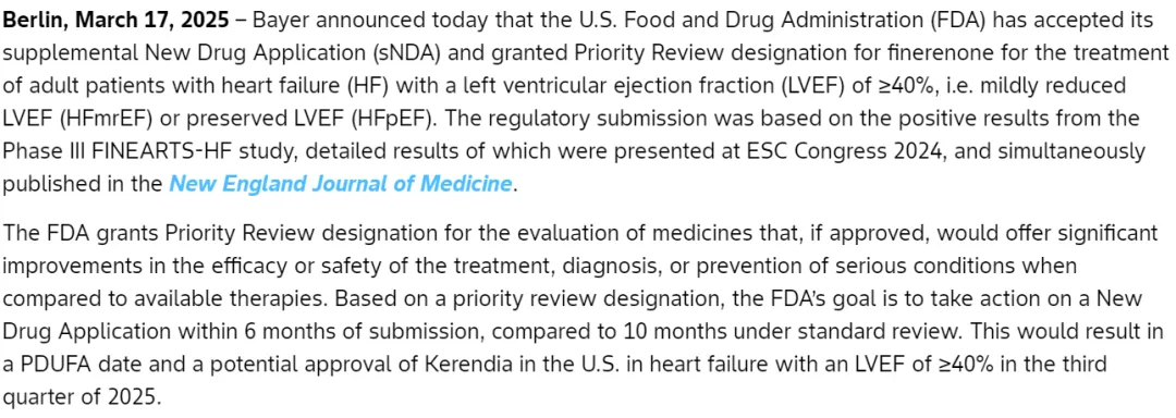 2025年3月17日,拜耳宣布非奈利酮治疗LVEF≥40%心衰患者的sNDA获得FDA受理并被授予优先审评资格,PDUFA日期为今年三季度。