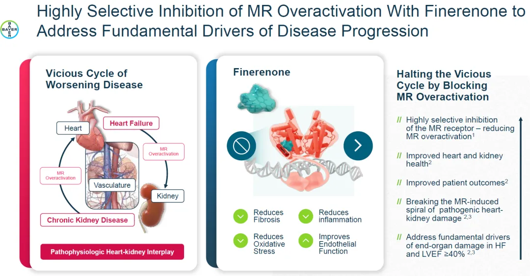 非奈利酮的作用机制刚好可以用来对抗心衰疾病进展的几个关键驱动因素。