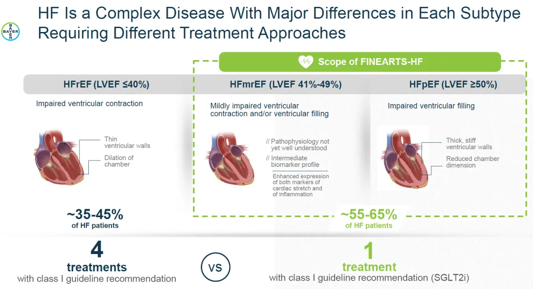 非奈利酮此次申报的LVEF≥40%的HFmrEF和HFpEF占到心衰患者的大半,且只有一种SGLT2抑制剂作为一类指南推荐用药,存在严重的未满足临床需求。