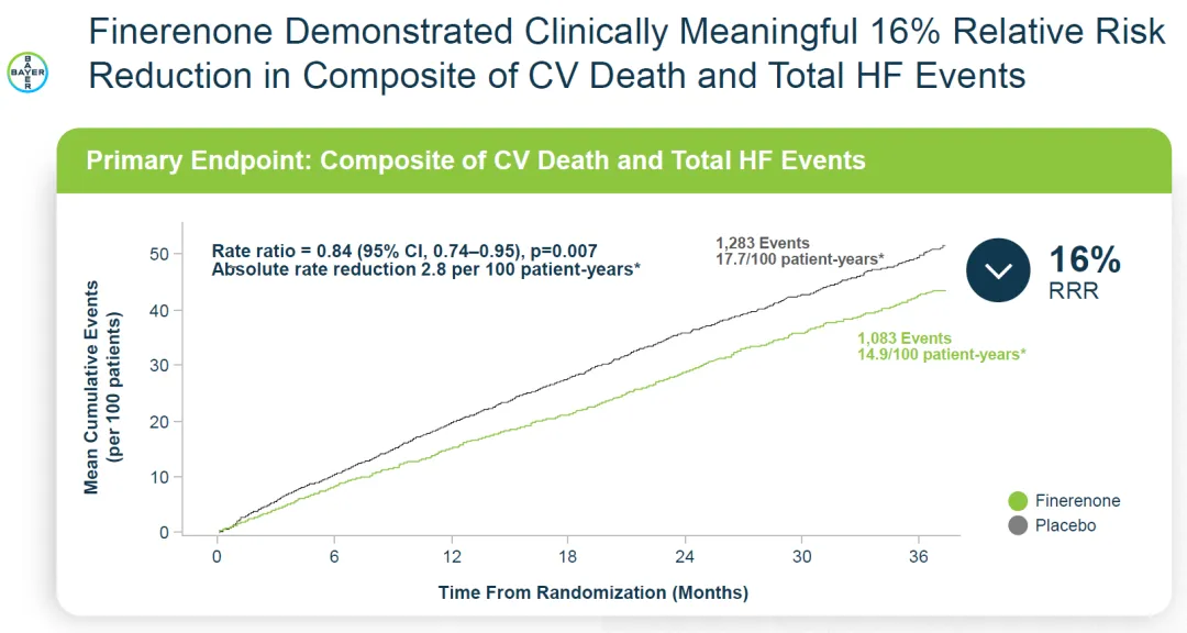 此次上市申请是依据FINEARTS-HF三期临床数据,根据去年NEJM和ESC公布的数据,可以将CV死亡和总心衰事件风险降低16%。