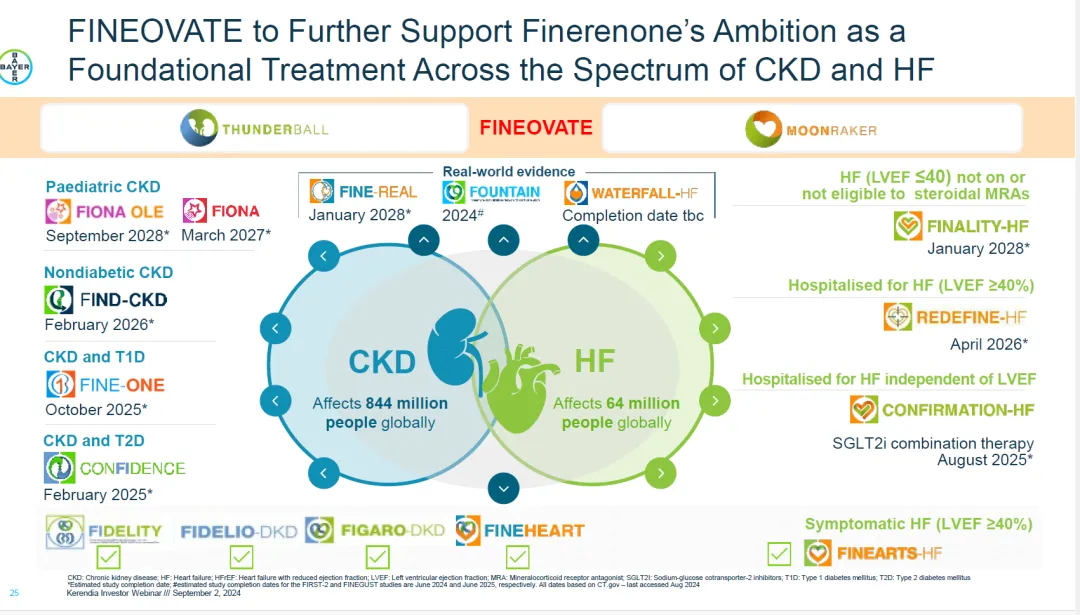 拜耳对非奈利酮的前景极具信心,认为其有望作为CKD和心衰领域的基础治疗方案,为此同时推进多项三期临床试验,期待其后续进展。