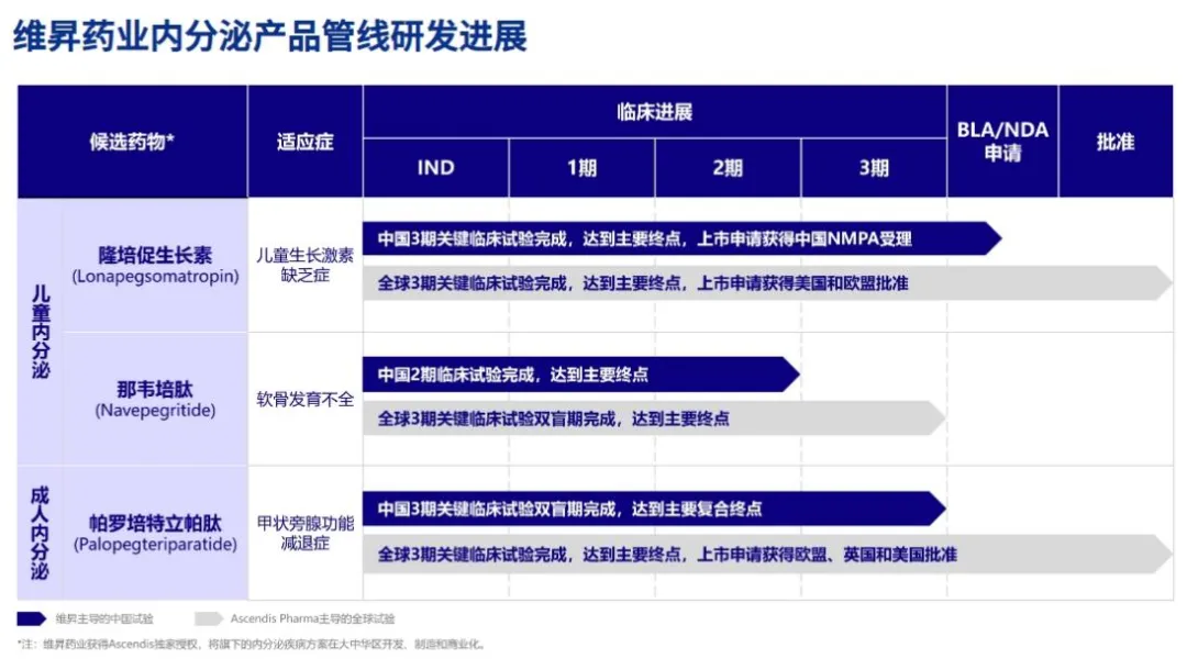 在维昇药业的3款内分泌产品中,隆培促生长素针对儿童内分泌,帕罗培特立帕肽针对成人内分泌,那韦培肽用于治疗软骨发育不全。