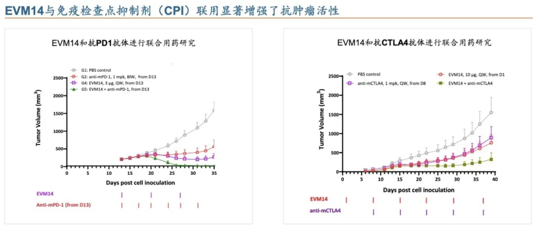 EVM14与PD-1/CTLA-4联用时,在多个小鼠同源肿瘤模型中,更是显著提升了抗肿瘤活性,为临床上探索联合用药方案提供了坚实支撑。