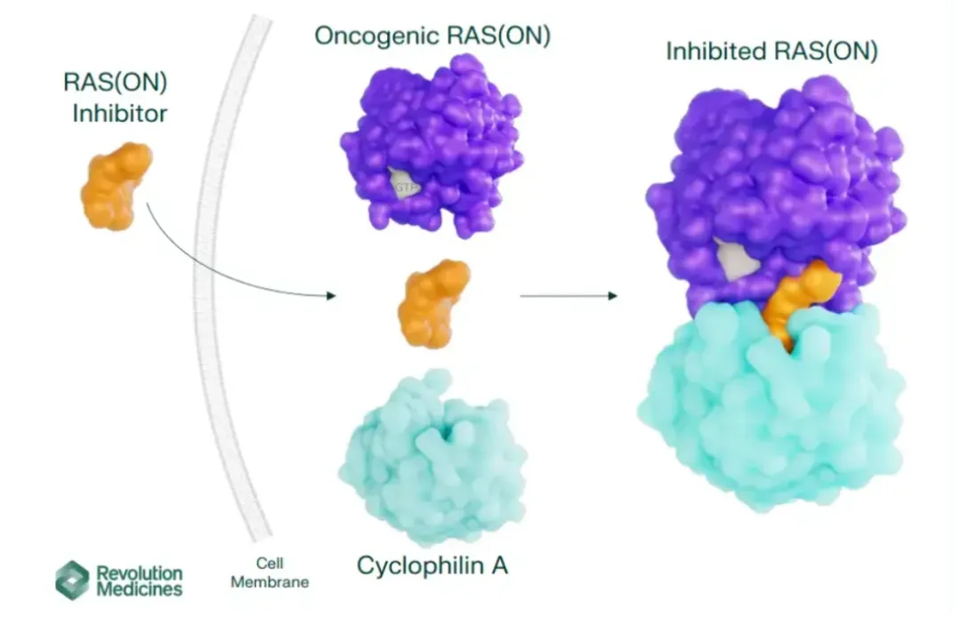 RMC-6236是一种非共价RAS(ON)多选择性抑制剂,其能够与CypA(亲环蛋白A)结合形成二元复合物,最终与不同的RAS(ON)蛋白结合成三元复合物,阻断KRAS与其下游信号因子之间的相互作用,达到抑制肿瘤的目的。