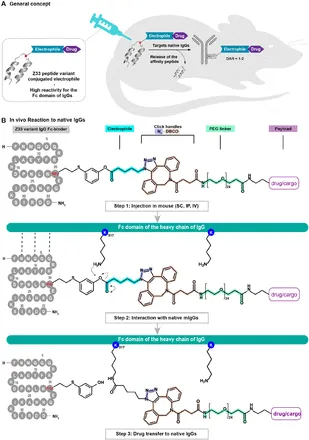 3月23-27日在圣地亚哥举行的美国化学学会(ACS)春季会议上,麻省理工学院(MIT)化学教授Bradley Pentelute展示了这项突破性成果。该技术被称为“体内抗体涂装”,其核心是一种由三部分组成的肽链:抗体结合区、药物负载区及反应区。前两部分分别负责锚定免疫球蛋白G(IgG)抗体和携带GLP-1药物,反应区则通过共价键将药物分子精准“涂”在抗体表面。