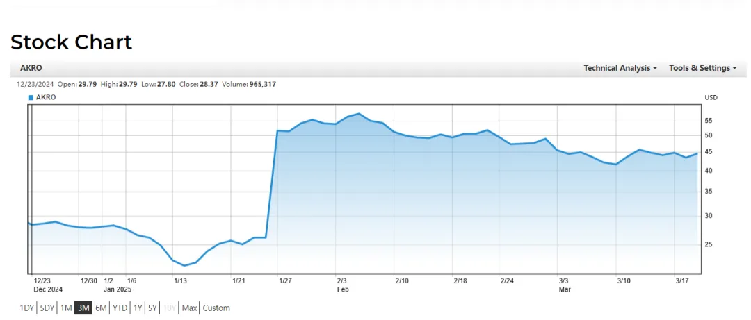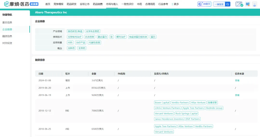 随后,公司获得了ATP、Atlas Venture、venBio Partners、Versant Ventures四家专注生命科学领域投资机构领投的6500万美元A轮融资,为公司的研发注入了强劲动力;2019年,公司成功进行IPO,募资1.058亿美元,进一步充实了研发资金储备;2022年、2023年和2024年,公司分别融资2.3亿美元、2.2亿美元和3.67亿美元;2025年1月30日,AkeroTherapeutics宣布完成了普通股的后续发行,筹集了4.025亿美元的总收益。发稿前市值约34.47亿美金,约合250亿人民币。