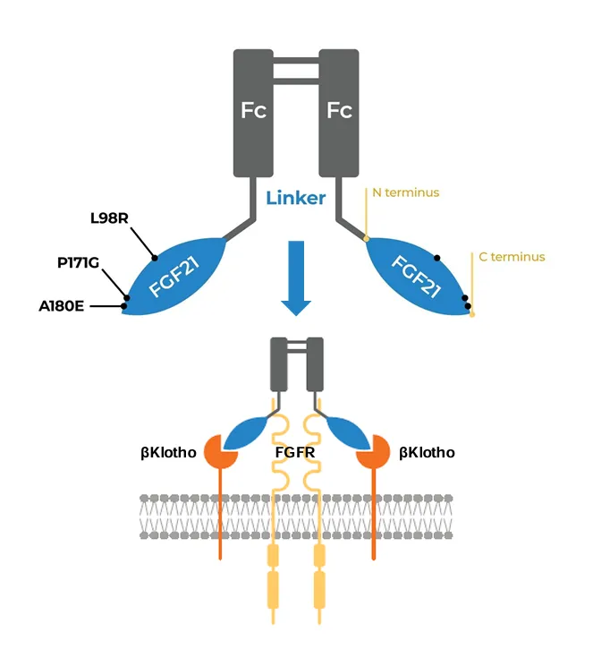 Efruxifermin(EFX)是FGF21(成纤维细胞生长因子21)的类似物,FGF21是一种内源性表达的激素,可抵御细胞应激并调节全身脂质、碳水化合物和蛋白质的代谢,通过作用于不同的FGF受体(FGFR),介导对脂肪组织代谢的直接自分泌作用。