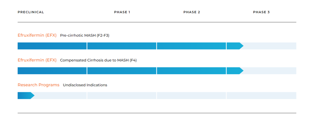 EFX经过工程改造,通过将半衰期从不到2小时延长到大约3天来克服内源性FGF21的局限性,同时保持FGF21在缓解细胞应激和调节全身代谢方面的天然作用。因此,EFX有可能解决MASH的潜在代谢疾病驱动因素,同时还可以逆转肝纤维化。