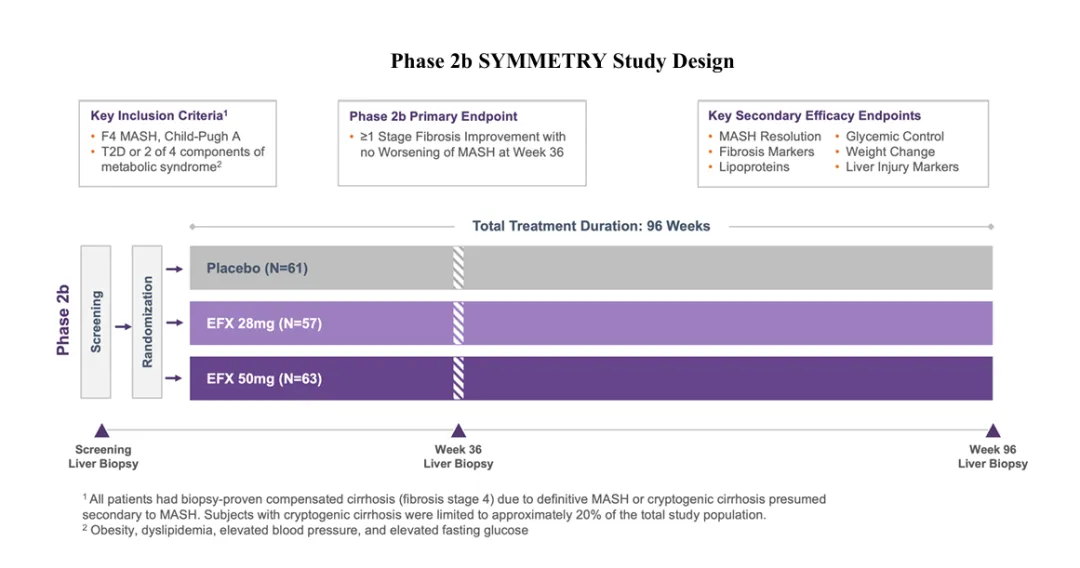 2025年1月,Akero Therapeutics报道了SYMMETRY试验第96周的初步顶线结果,这项临床试验2b期研究是为期96周的多中心、随机、双盲、安慰剂对照、剂量范围试验,评估了EFX在活检证实的MASH引起的代偿期肝硬化(F4,Child-Pugh A级)患者中的疗效和安全性。182例患者被随机分配接受每周一次的皮下注射28mg或50mgEFX或安慰剂。主要疗效终点是在第36周时纤维化至少达到一期改善且MASH没有恶化的受试者比例;关键的次要终点包括纤维化改善但MASH没有恶化,第96周时MASH消退没有纤维化恶化,以及第36周和第96周时肝纤维化和肝损伤的无创标志物、胰岛素敏感性和脂蛋白相对于基线的变化,以及安全性和耐受性的测量。