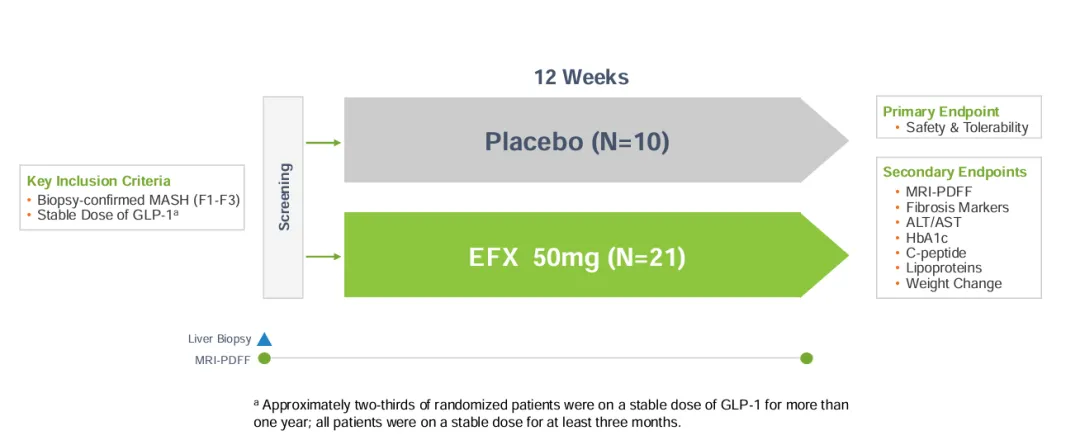 目前EFX正在评估五项随机、双盲、安慰剂对照临床试验的结果,根据目前报告的试验,共有385名患有MASH和/或2型糖尿病的成年患者接受了EFX治疗并评估了长达96周。