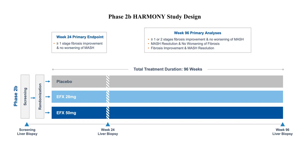 2024年3月,Akero Therapeutics报告了HARMONY试验第96周的初步顶线结果,这是一项临床试验2b期研究,旨在评估EFX在肝硬化前MASH(F2-F3)患者中的疗效和安全性。该研究的主要疗效终点是在第24周时纤维化至少达到一期改善而MASH没有恶化的受试者比例。关键的次要组织学终点包括无纤维化恶化的MASH消退,第24周和第96周时MASH消退和纤维化改善的复合终点,以及第96周时纤维化改善而MASH无恶化。其他次要指标包括肝脏脂肪相对于基线的变化、肝纤维化的无创标志物、血糖控制、脂蛋白和体重,以及安全性和耐受性测量。