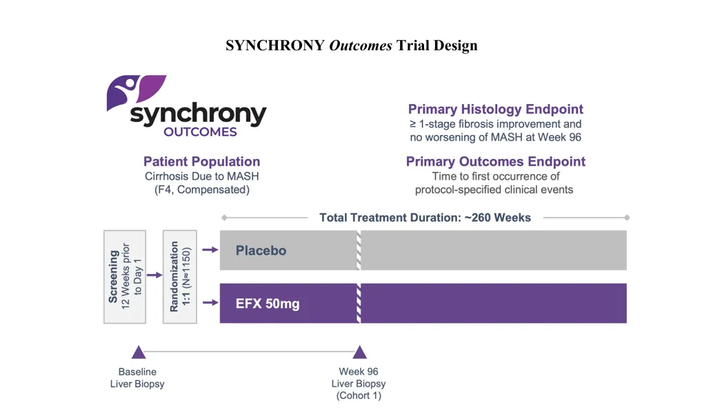 其中,SYNCHRONY Outcomes是一项双队列试验,评估EFX治疗因MASH引起的代偿期肝硬化(F4,Child-Pugh A 级)患者,患者每周接受EFX 50mg或安慰剂注射。仅针对队列1的主要组织学终点是治疗96周后纤维化改善≥1期且脂肪性肝炎无恶化的患者比例;队列1和队列2中入组的所有患者的主要结果终点是从随机分组到首次出现任何方案指定的临床事件的时间。