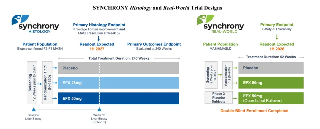 SYNCHRONYHistology是一项双队列试验,评估EFX治疗肝硬化前MASH(F2-F3)患者,患者每周接受28mg、50mgEFX或安慰剂注射。队列1和队列2中的所有患者都将接受长达240周治疗的长期临床结果评估。SYNCHRONYHistology研究的52周主要组织学终点预计将于2027年上半年出结果。