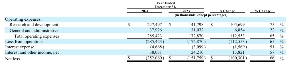 2024年度,Akero Therapeutics的研发费用2.475亿美元,上年同期为1.418亿美元。一般和行政费用为3790万美元,总运营支出为2.854亿美元。