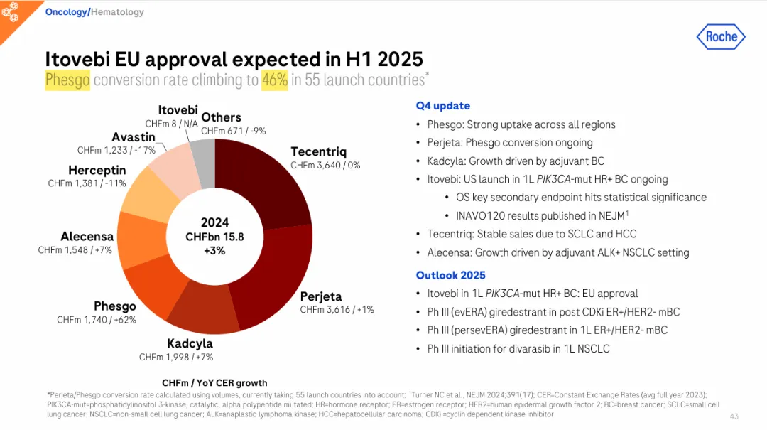 皮下复方制剂Phesgo的出现,将此前2-6小时的注射时间缩短至5-8分钟,依从性大为提高。更重要的是,随着曲妥珠单抗和帕妥珠单抗专利相继失效,Phesgo也接过了产品生命周期的接力棒,上市5年来产品转化率已经达到46%,稳住了罗氏在此领域的整体市场份额。