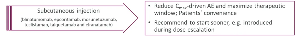 对于CD3类的双抗,虽然皮下制剂的采用能够减少部分Cmax带来的不良作用,但是基于特定的T细胞激活能力和药物剂量,已经比较显著的ADA和CRS作用是否在皮下制剂下更为显著,这同样需要关注。
